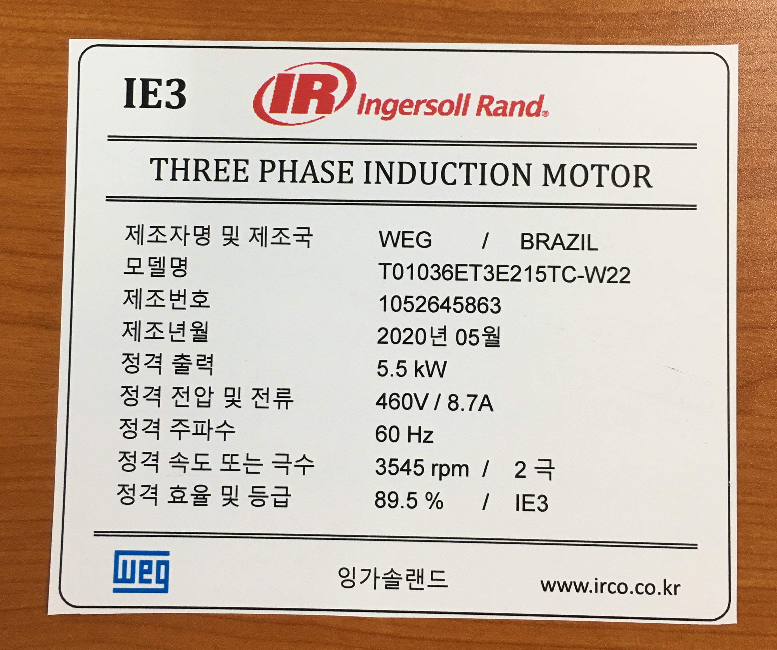 | 정격출력(㎾) | 5.5 | 평균전부하효율(%) | 91.2 |